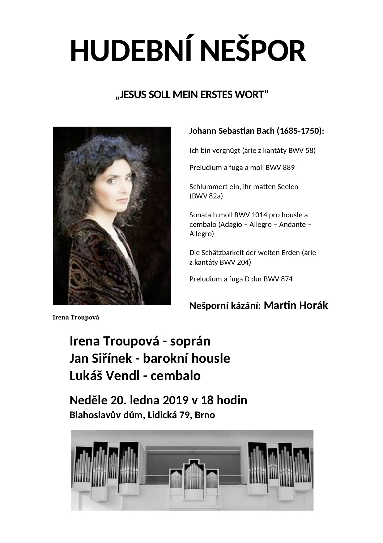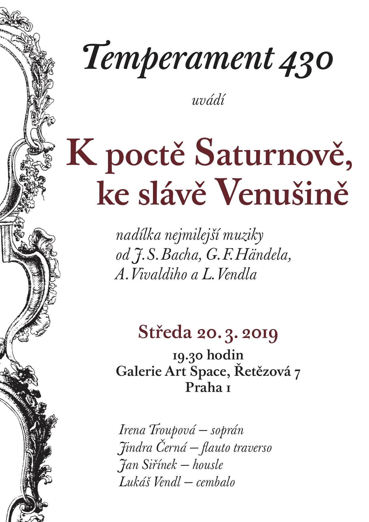 „K poctě Saturnově, ke slávě Venušině“ uvede soubor Temperament 430 kantáty, árie i triové sonáty Johanna Sebastiana Bacha, Georga Fridricha Händela a Antonia Vivaldiho. Zazní také skladba „Saturnus“, do které Lukáš Vendl zakomponoval kryptogramy, jimiž hvězdáři zvěstovali objev Saturnova prstence. Vystoupí Irena Troupová (soprán), Jindra Černá (flauto traverso), Jan Siřínek (housle) a Lukáš Vendl (cembalo). Více informací najdete zde.