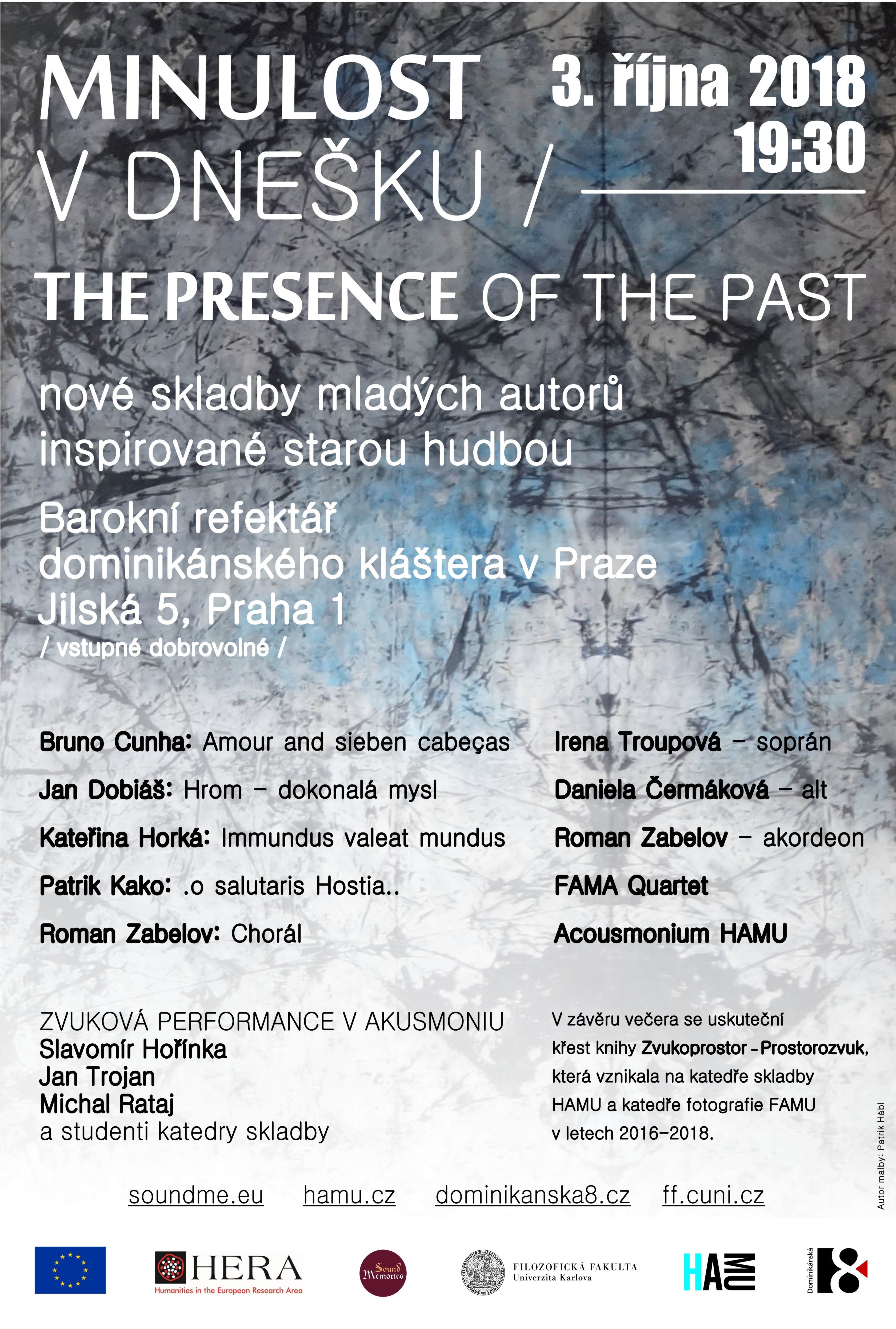 Program koncertu Minulost v dnešku /The presence of the past/ představí nové skladby mladých autorů – Bruno Cunha, Jan Dobiáš, Kateřina Horká, Patrik Kako, Roman Zabelov. Díla inspirovaná starou hudbou představí Irena Troupová, Daniela Čermáková, Roman Zabelov, FAMA Quartet a Acousmonium HAMU.