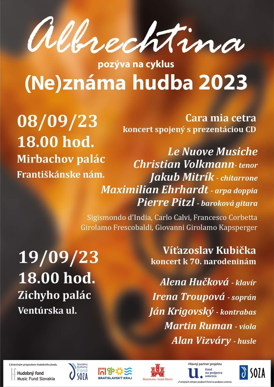 V úterý 19. září 2023 v 18.00 hodin zazní v Zichyho paláci v Bratislave osmý letošní koncert cyklu (Ne)známa hudba. Koncert při příležitosti 70. narozenin Víťazoslava Kubičky uvádí spolek Albrechtina, účinkují: