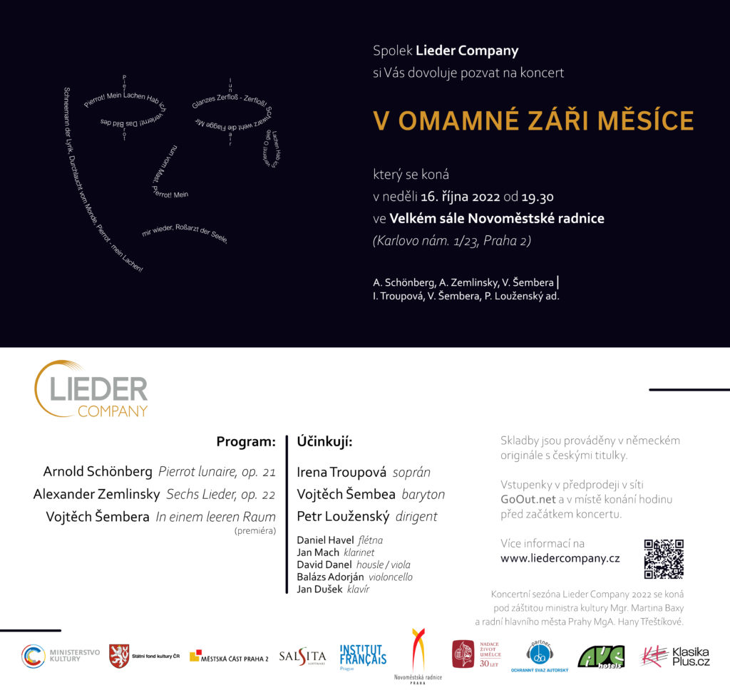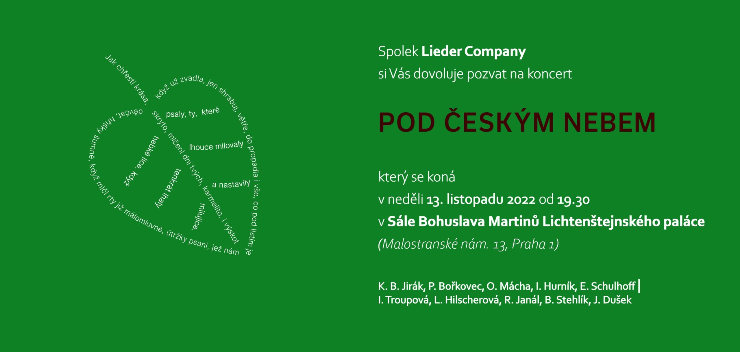 Jirák, Bořkovec, Schulhoff: Skladby těchto autorů, ale i díla O. Máchy a Ilji Hurníka uvádí spolek Lieder Company v programu s názvem Pod českým nebem. Tvorbou na texty lidové poezie a českých básníků Jaroslava Seiferta a Vítězslava Nezvala provedou kromě Ireny Troupové i mezzosopranistka Lucie Hilscherová, barytonista Roman Janál a klavíristé Bohumír Stehlík a Jan Dušek.